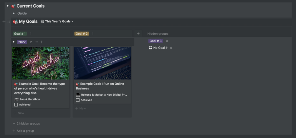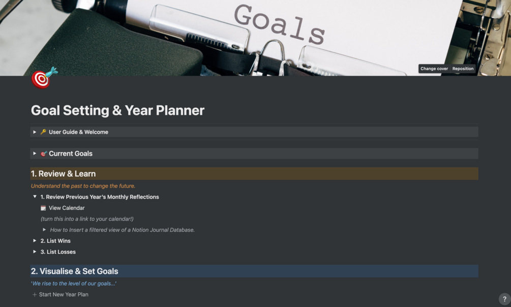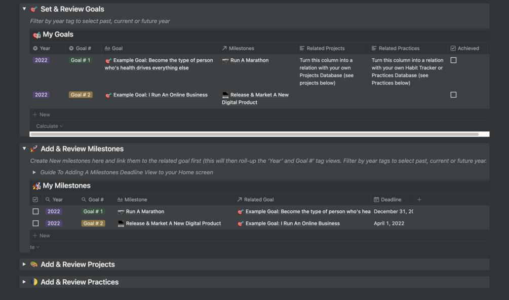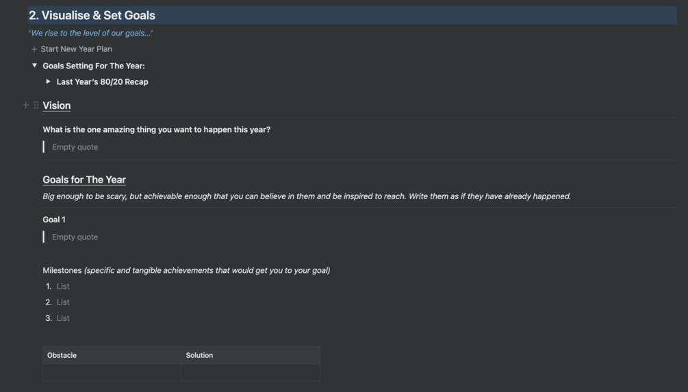 Plan your year and set goals in Notion with this annual review template that will prompt you through the process of leveraging more from this year! Action your goals, set milestones and plan out further actions for the year into your wider system.