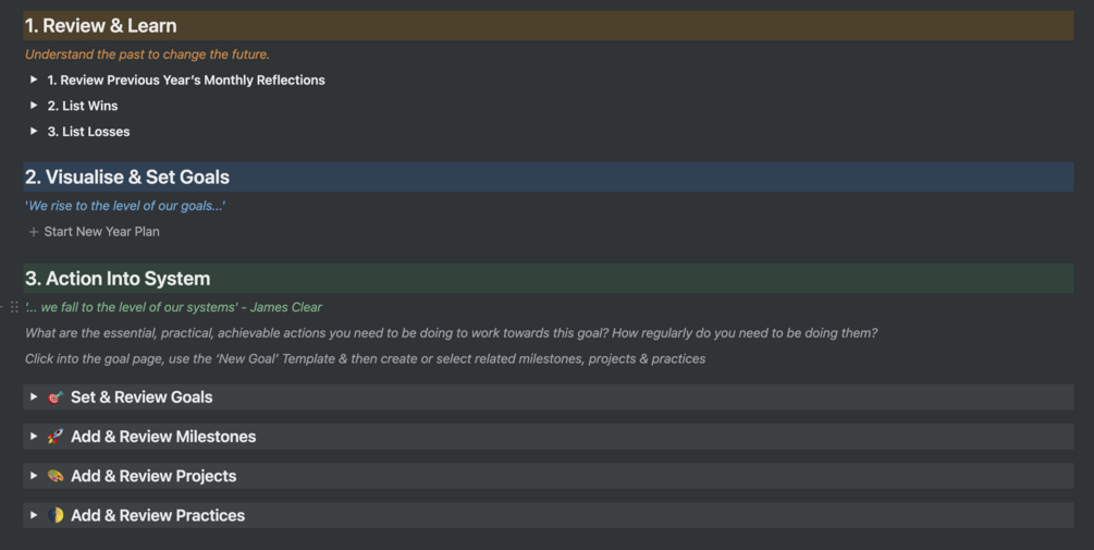 Plan your year and set goals in Notion with this annual review template that will prompt you through the process of leveraging more from this year! Action your goals, set milestones and plan out further actions for the year into your wider system.